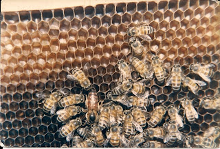 | Foto da Abelha Rainha (ela é maior e mais escura do que as operárias) |